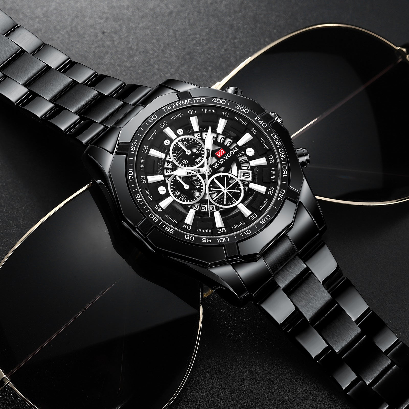 Мужские водонепроницаемые кварцевые часы со стальным браслетом, тремя глазами и шестью стрелками, светящимся календарем